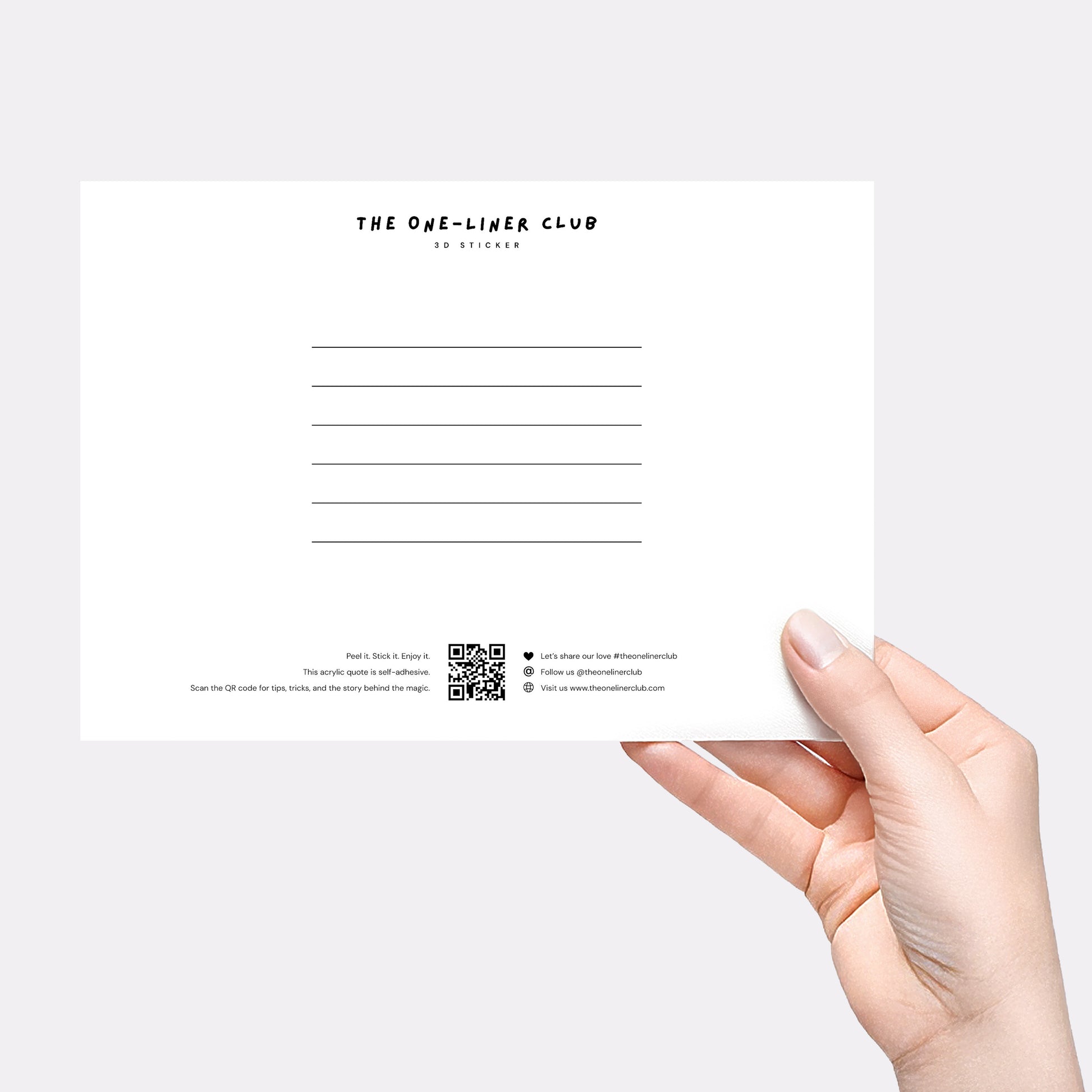 Our self-adhesive one-liners stick to almost any smooth, dust-free surface, from walls to cupboards to mirrors, you name it. Each quote comes 'ready-to-stick' on an A5 card, with the adhesive already applied.