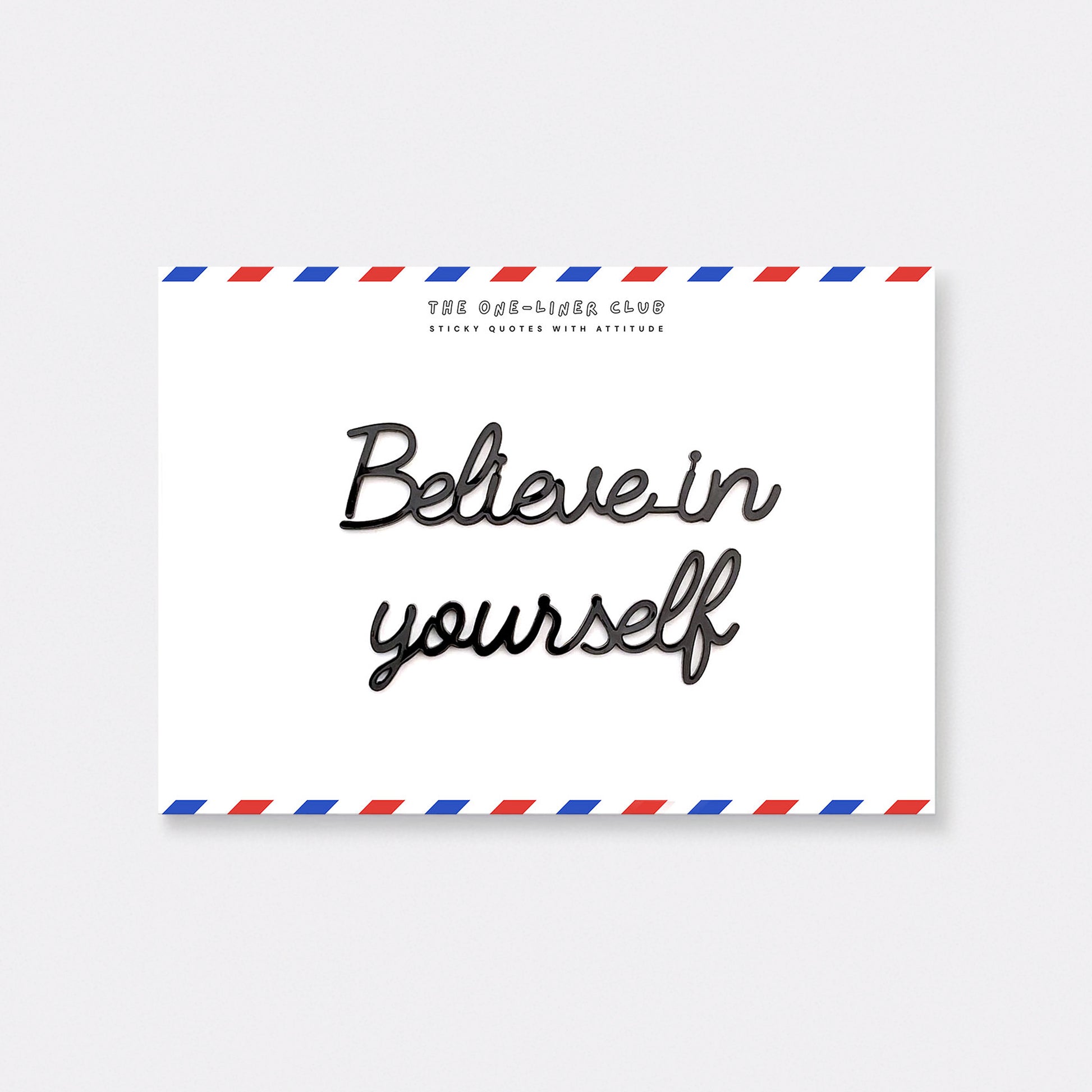 Our self-adhesive one-liners stick to almost any smooth, dust-free surface, from walls to cupboards to mirrors, you name it. Each quote comes 'ready-to-stick' on an A5 card, with the adhesive already applied.