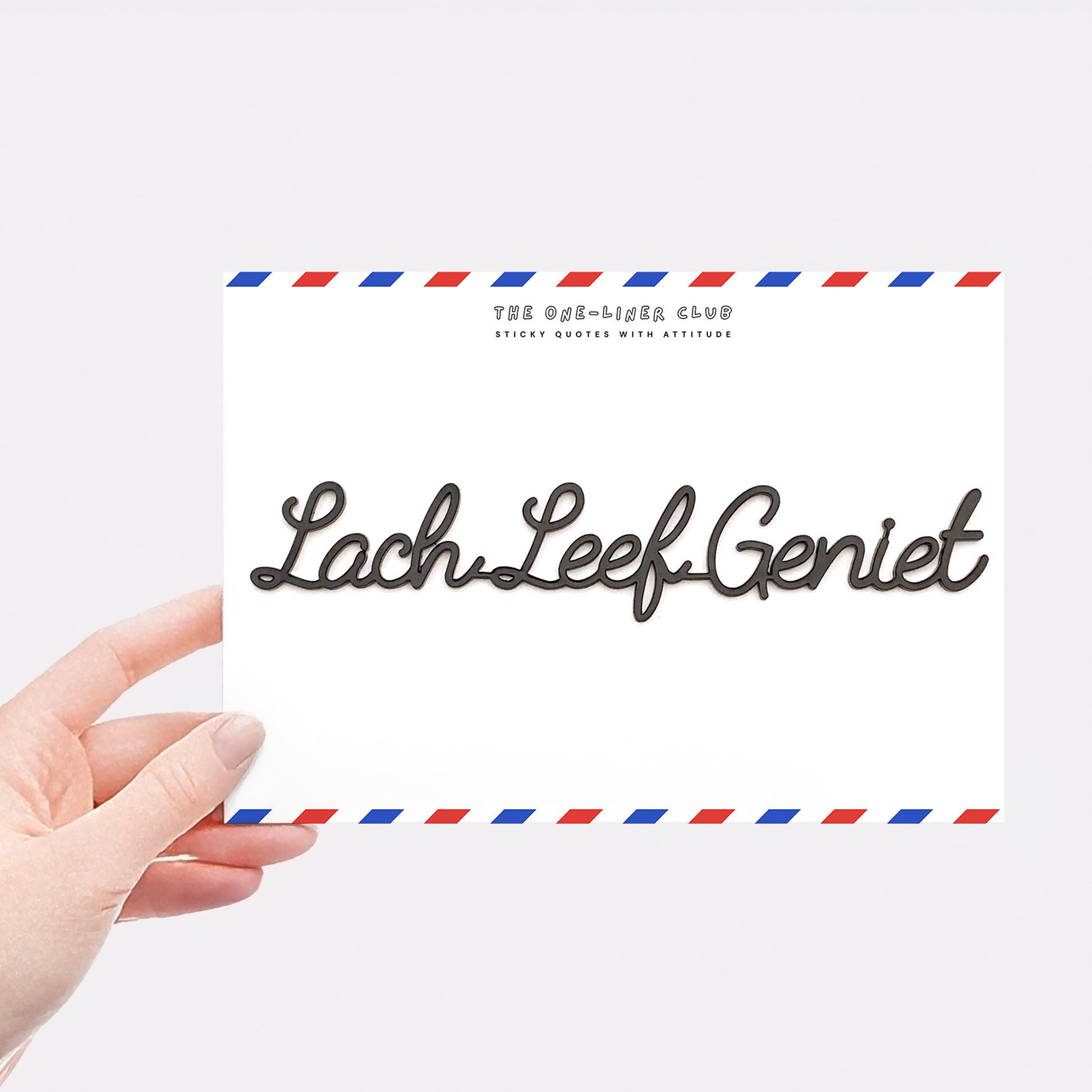 Our self-adhesive one-liners stick to almost any smooth, dust-free surface, from walls to cupboards to mirrors, you name it. Each quote comes 'ready-to-stick' on an A5 card, with the adhesive already applied.