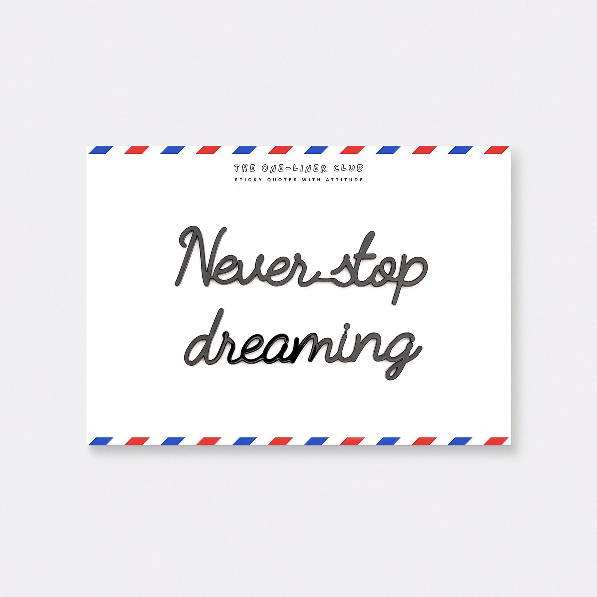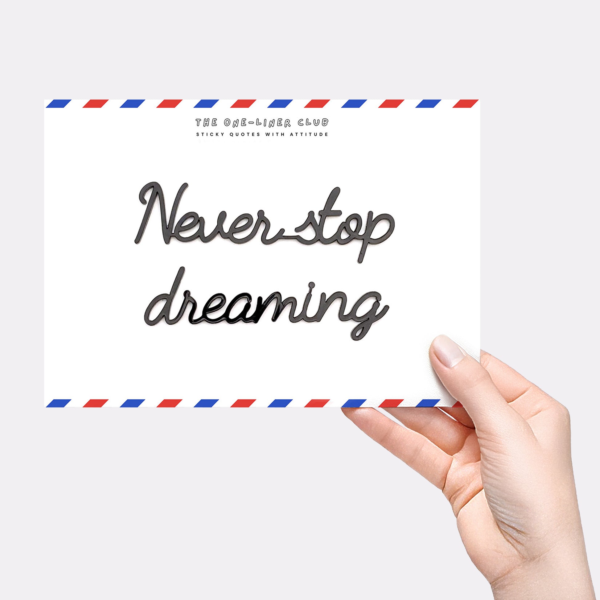 Our self-adhesive one-liners stick to almost any smooth, dust-free surface, from walls to cupboards to mirrors, you name it. Each quote comes 'ready-to-stick' on an A5 card, with the adhesive already applied.