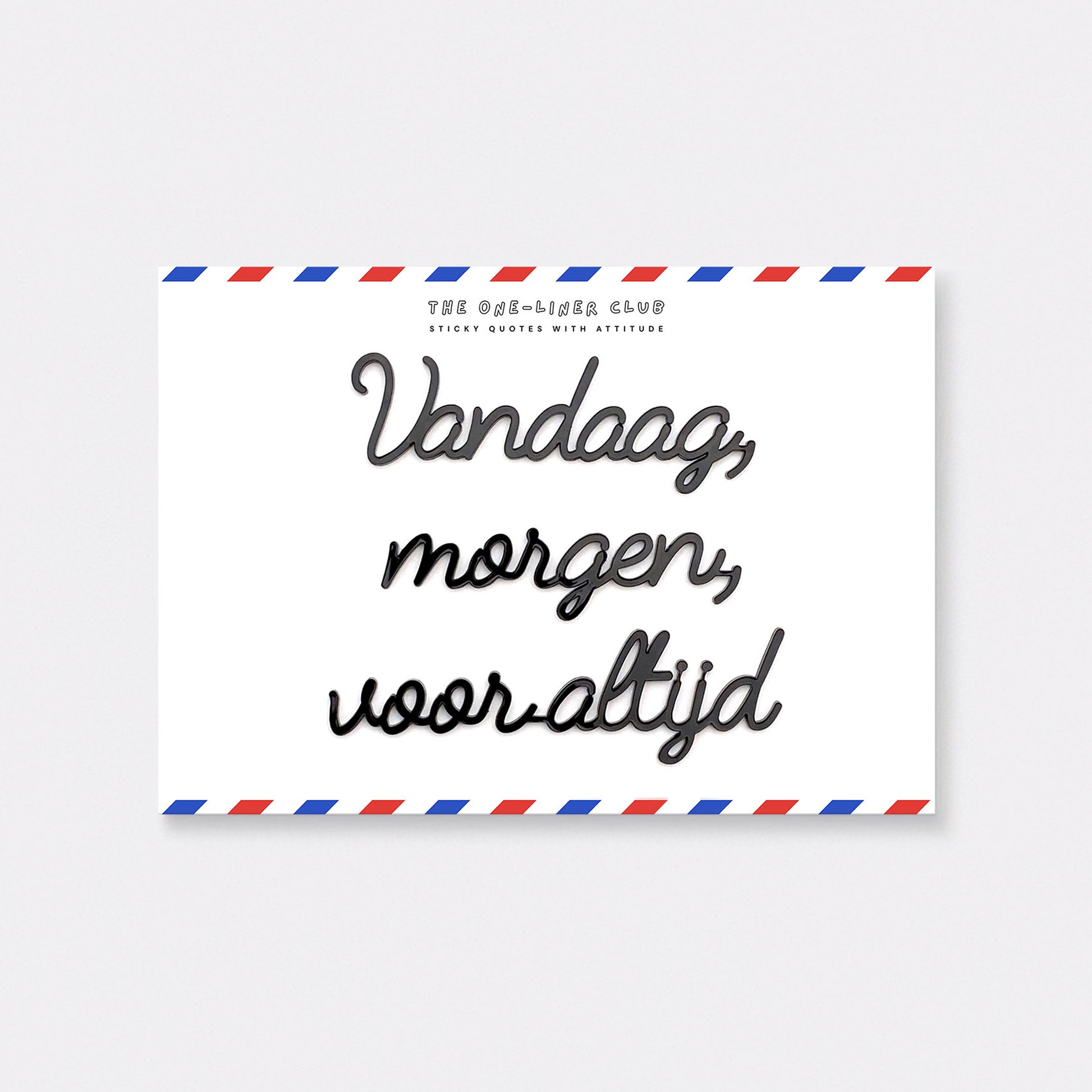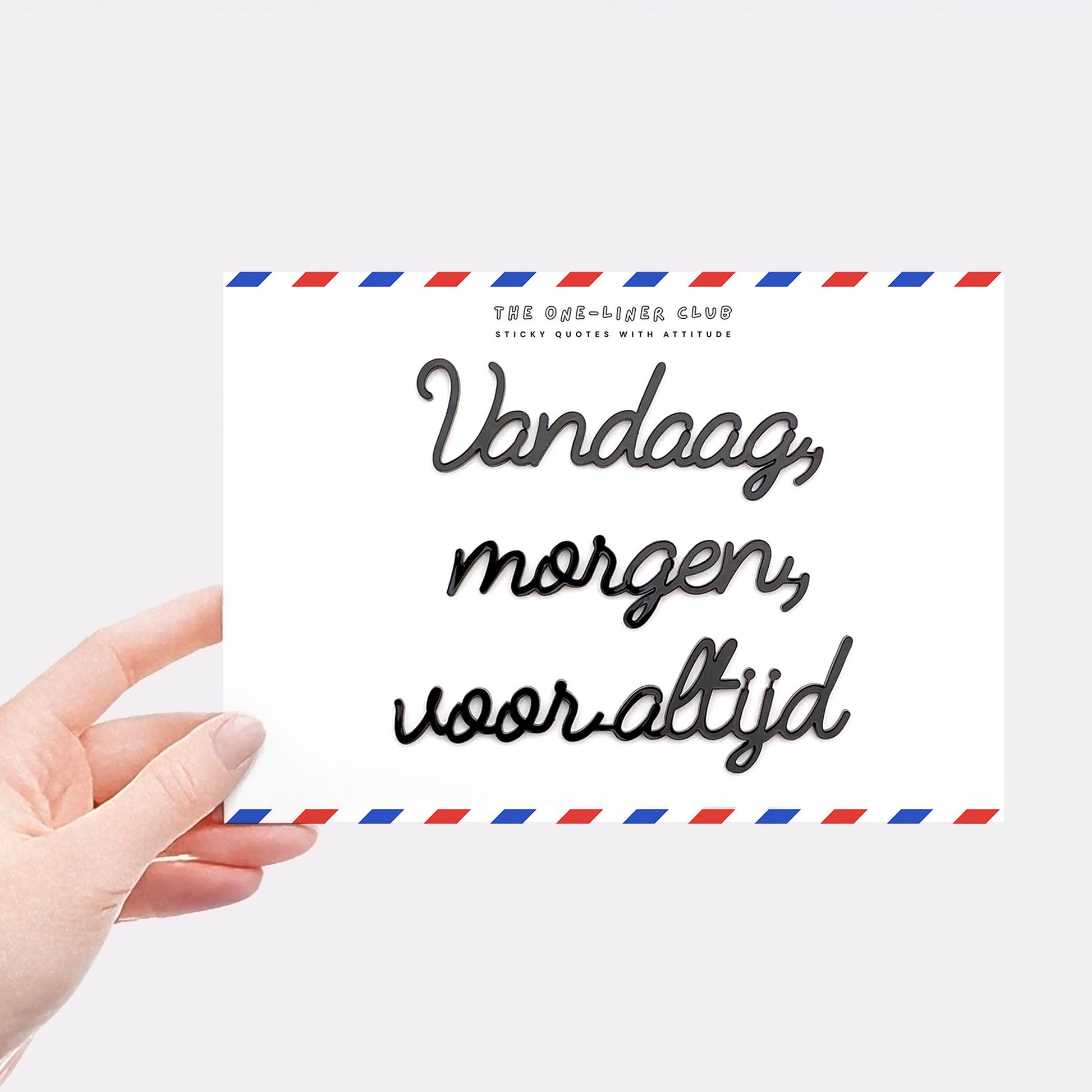 Our self-adhesive one-liners stick to almost any smooth, dust-free surface, from walls to cupboards to mirrors, you name it. Each quote comes 'ready-to-stick' on an A5 card, with the adhesive already applied.